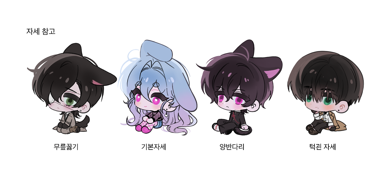 - 캐릭터 정보 :: 전신 이미지와 중요 포인트, 자세 (무릎꿇기 / 기본자세 / 양반다리 / 턱괸자세), 귀 꼬리 유무 (동물 종류)