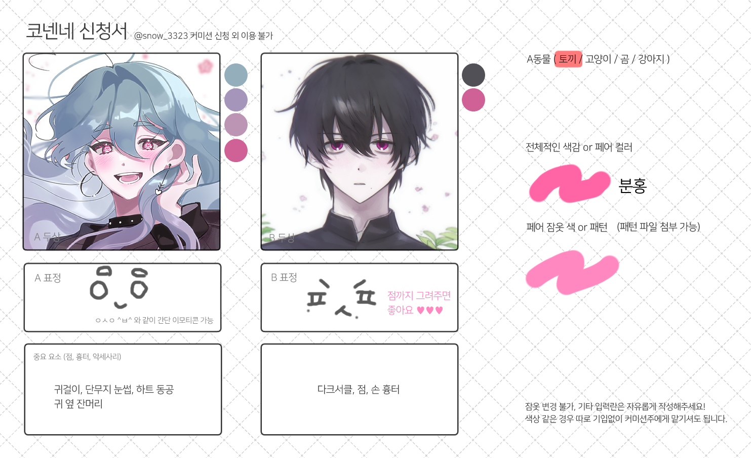 ❄ 작업물 상단 혹은 하단에 제 아이디(@snow_3323) 가 들어가며 사용하실 땐 제 커미션임을 꼭 명시한 뒤 사용해주세요.
